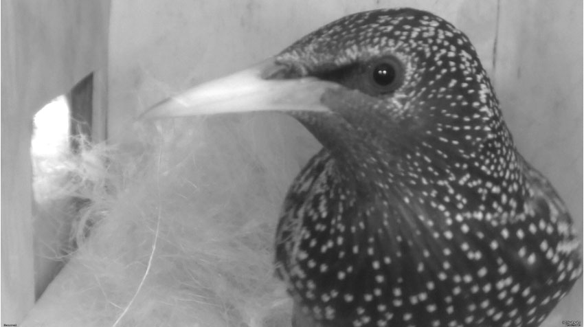 Större holk för starar. Den är inbyggd på insidan väggen i ett uthus. Första ägget 23 april.
